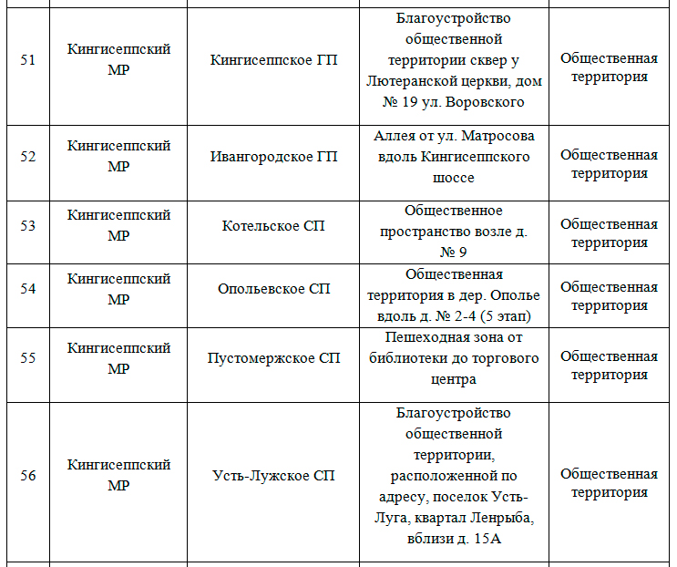 Список территорий Кингисеппского района, где в 2024 году запланировано благоустройство. Работы пройдут по федеральному проекту «Формирование комфортной городской среды» нацпроекта «Жилье и городская среда», инициированного президентом России Владимиром Путиным.