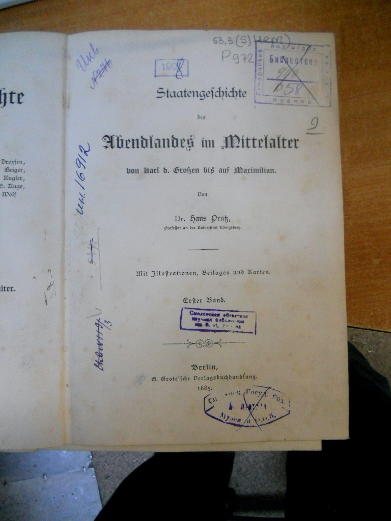 Вторая книга «Staatengeschichte des Abendlandes im Mittelalter von Karl d. Grossen bis auf Maximilian» von Dr. Hans Pruts – одна из главных работ германского историка Ганса Пруца «История европейских государств в средние века от Карла Великого до Максимилиана». Издание напечатано на 727 листах.