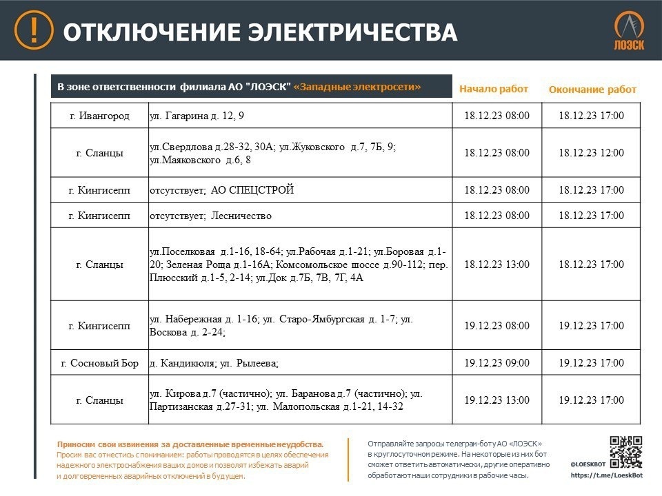 АО «ЛОЭСК» опубликовало график и территории плановых отключений электроснабжения