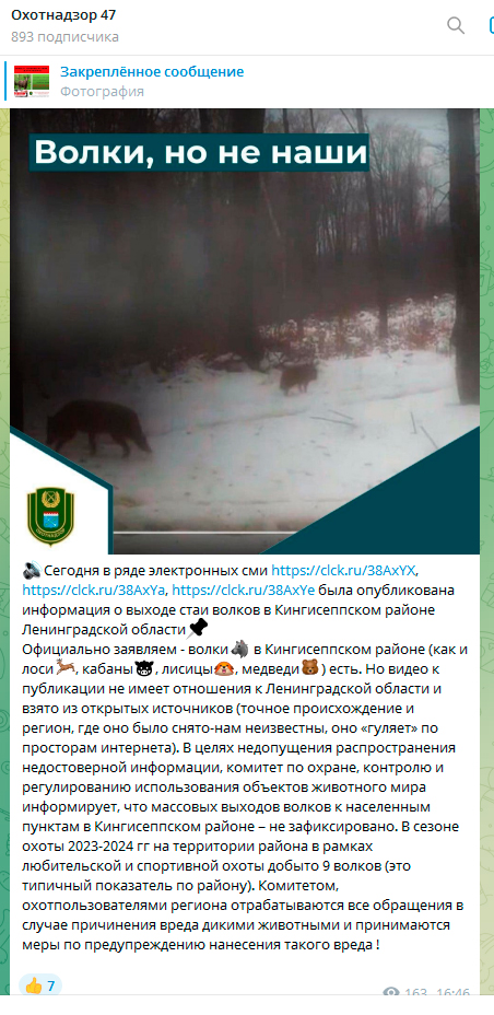 Сегодня (24 января) в ряде электронных сми была опубликована информация о выходе стаи волков в Кингисеппском районе Ленинградской области. Официально комитет по животному миру ЛО - волки в Кингисеппском районе (как и лоси, кабаны, лисицы, медведи) есть. Но видео к публикации не имеет отношения к Ленинградской области и взято из открытых источников (точное происхождение и регион, где оно было снято-нам неизвестны, оно «гуляет» по просторам интернета). В целях недопущения распространения недостоверной информации, комитет по охране, контролю и регулированию использования объектов животного мира информирует, что массовых выходов волков к населенным пунктам в Кингисеппском районе – не зафиксировано.