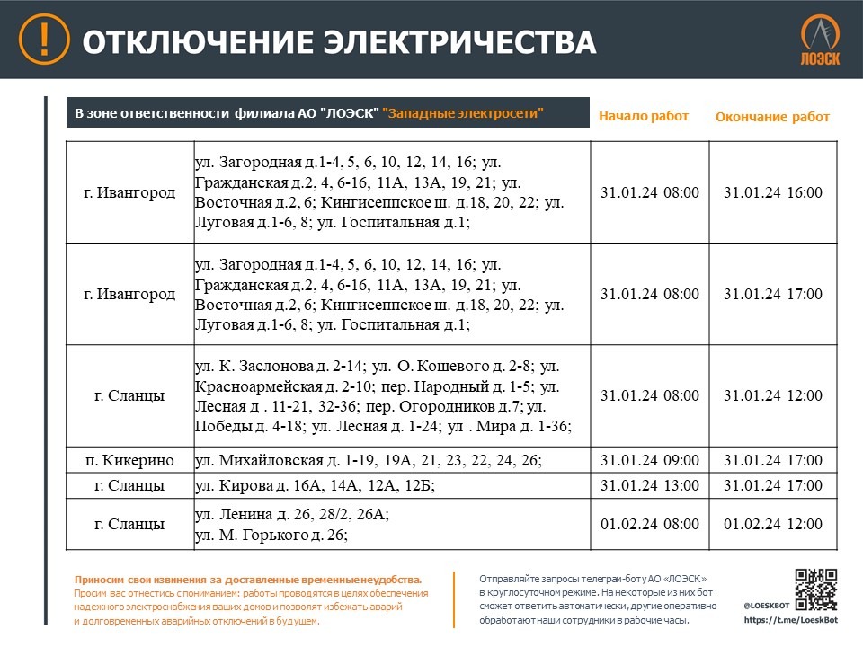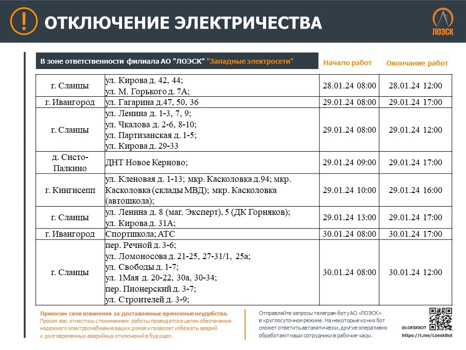 Компания ЛОЭСК опубликовала информацию об отключении электричества с 29 января по 4 февраля