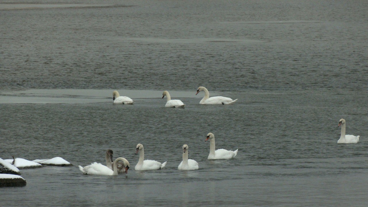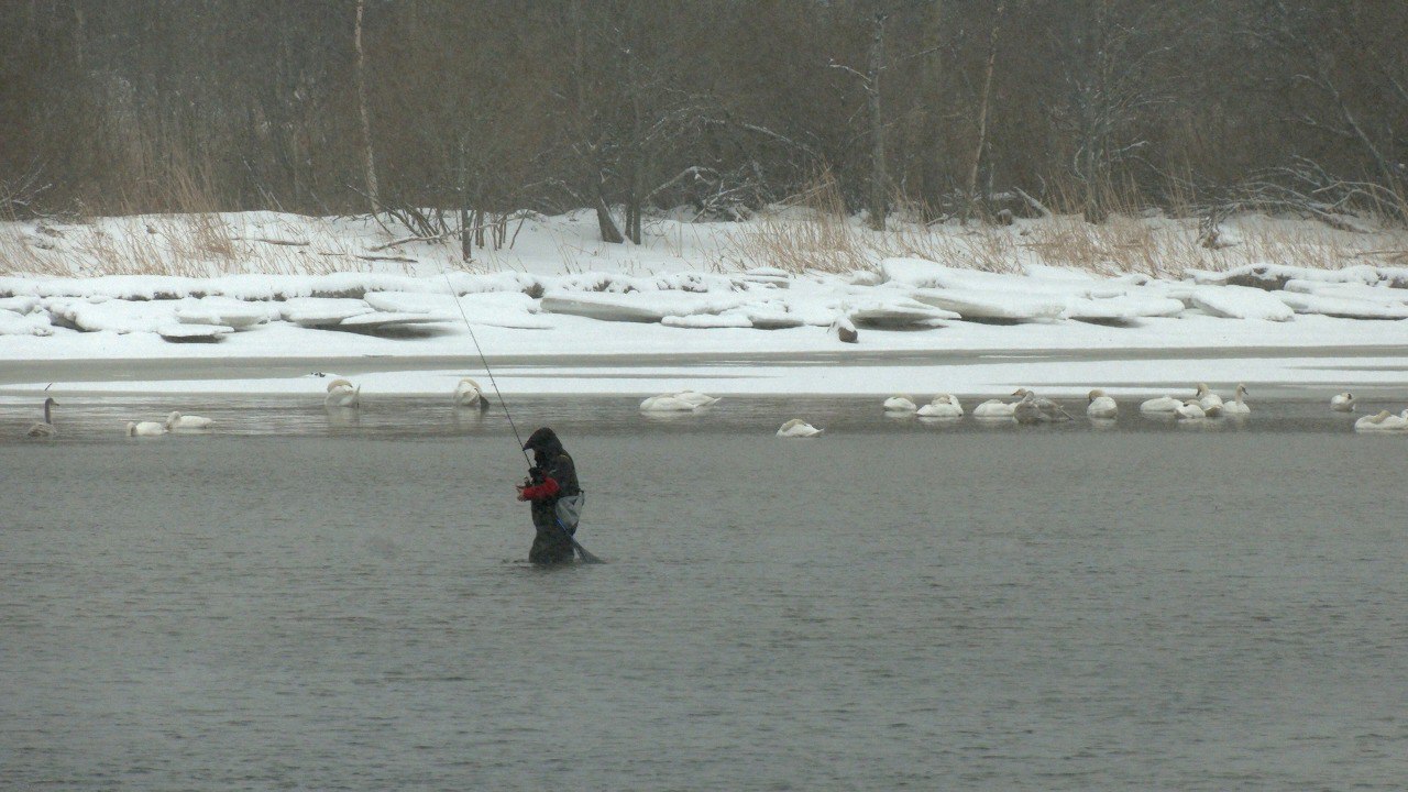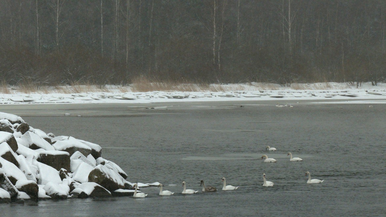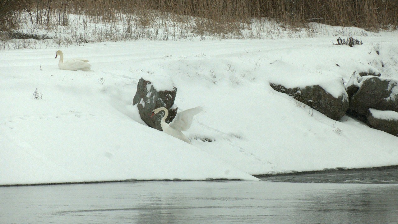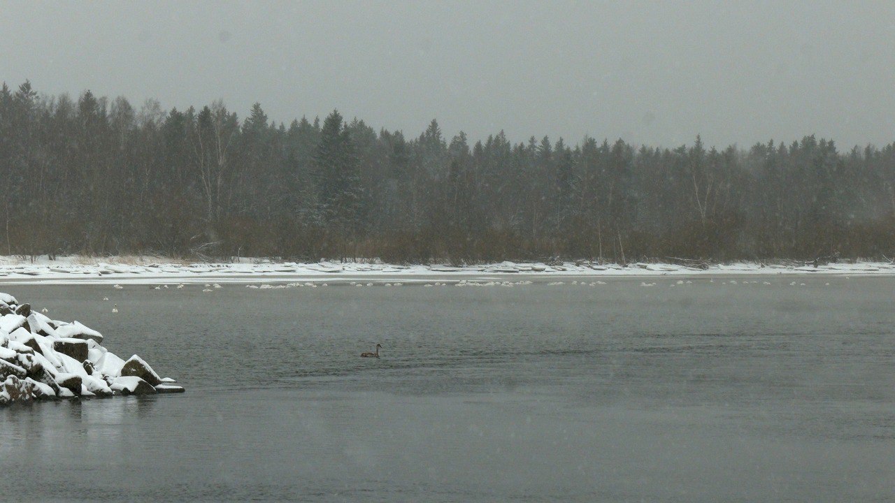 На заливе зимуют два вида: лебеди-кликуны и лебеди-шипуны, причём последних – явное большинство. Птицы остаются здесь уже третью зиму подряд, хотя в прошлом году их было в два раза меньше. Похоже мы становимся свидетелями образования на Финском заливе круглогодично живущей группировки птиц. Пернатые остались зимовать в этом месте благодаря наличию незамерзающего участка воды. То что в этой части залива неглубоко, нам стало понятно, когда рядом с лебедями появился любитель зимней рыбалки. Удивительно: дикие птицы совершенно не боятся человека. К людям они начинают привыкать, и наша снежная зима их, похоже, не смущает. Адаптировались...