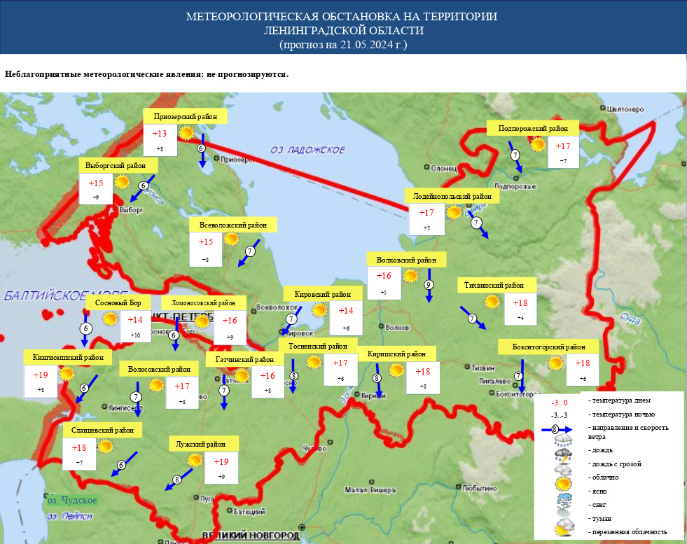 О погоде в Ленинградской области на завтра, 21 мая, сообщает пресс-служба ГУ МЧС по Ленобласти.