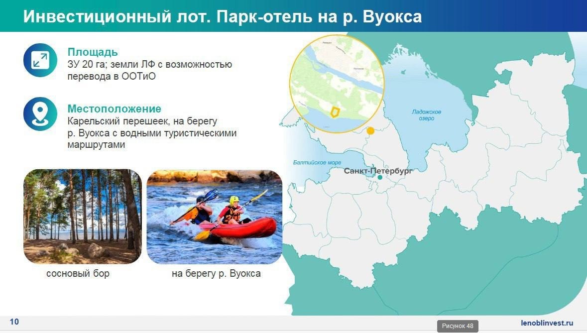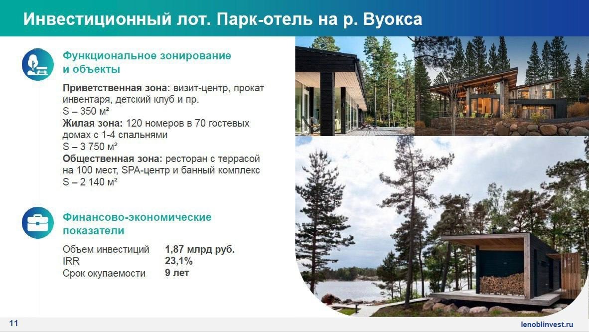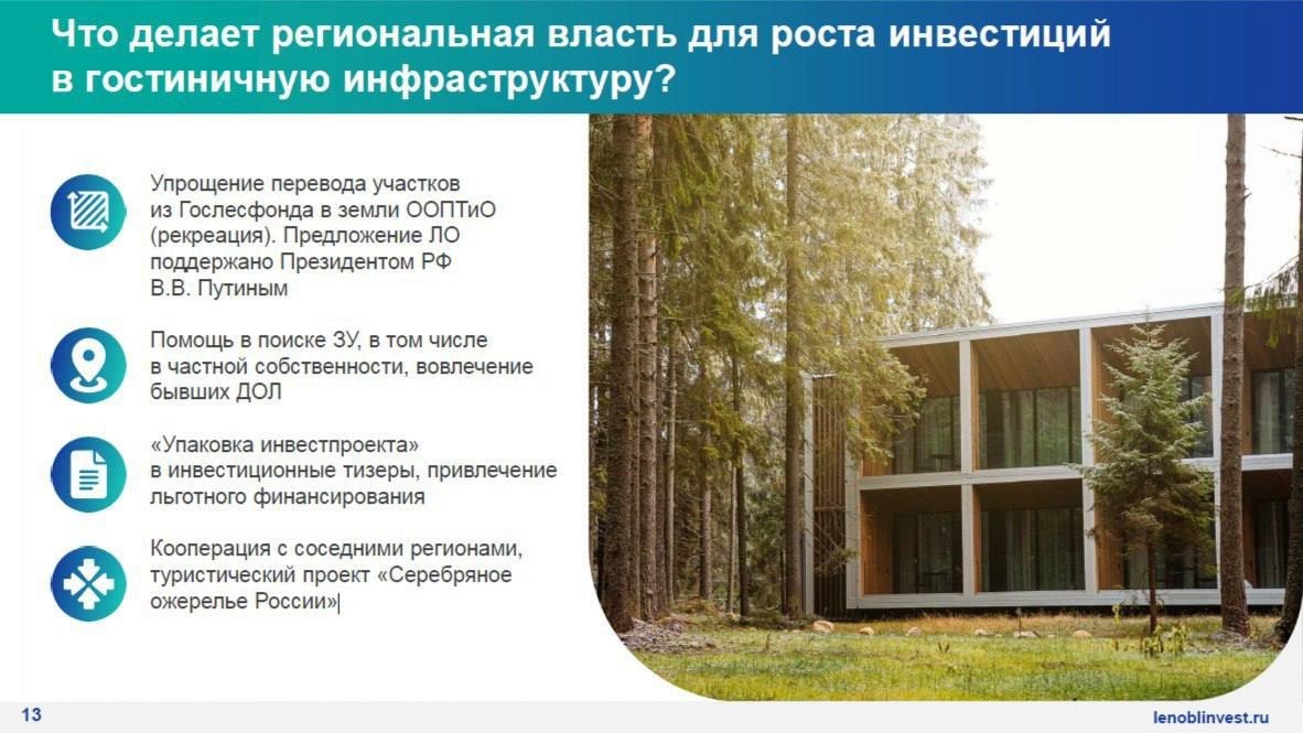 «В Ленобласти разработана первая в России региональная инвестиционная стратегия развития туристской инфраструктуры. Ее цель – привлечь инвестиции в создание коллективных средств размещения. Результатами стратегии являются 10 точек роста для развития туристской инфраструктуры и 6 инвестиционных лотов, в том числе на землях лесного фонда. В рамках апробации нового механизма предлагаем всем желающим инвесторам пройти этот путь вместе», – отметил Степан Каменецкий.