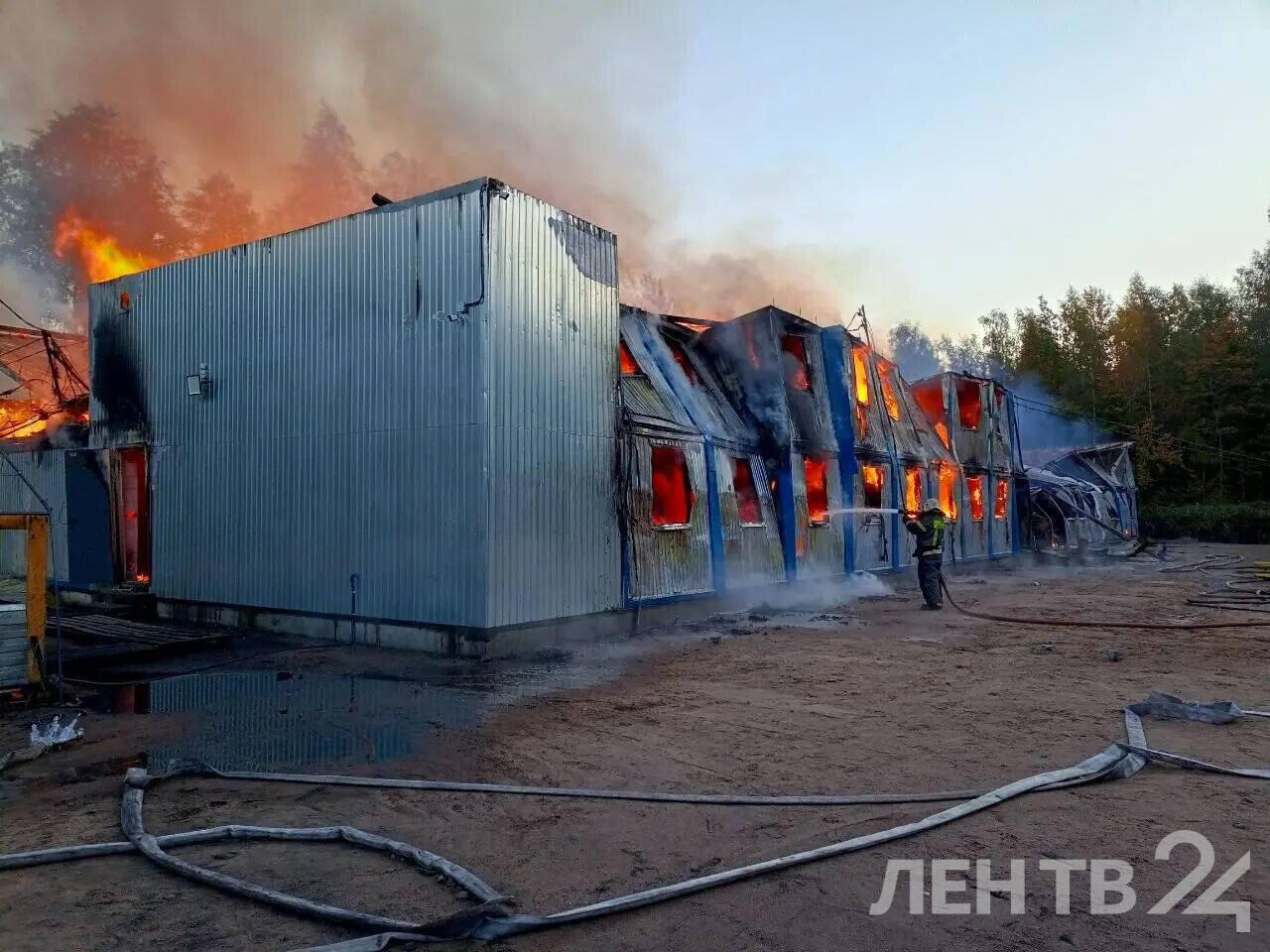 Когда на место происшествия прибыли пожарные, горели установленные в два яруса бытовки. Пожару был присвоен ранг 1БИС. 07:58 отказ от БИС, локализация. Площадь возгорания и информация о пострадавших уточняется.