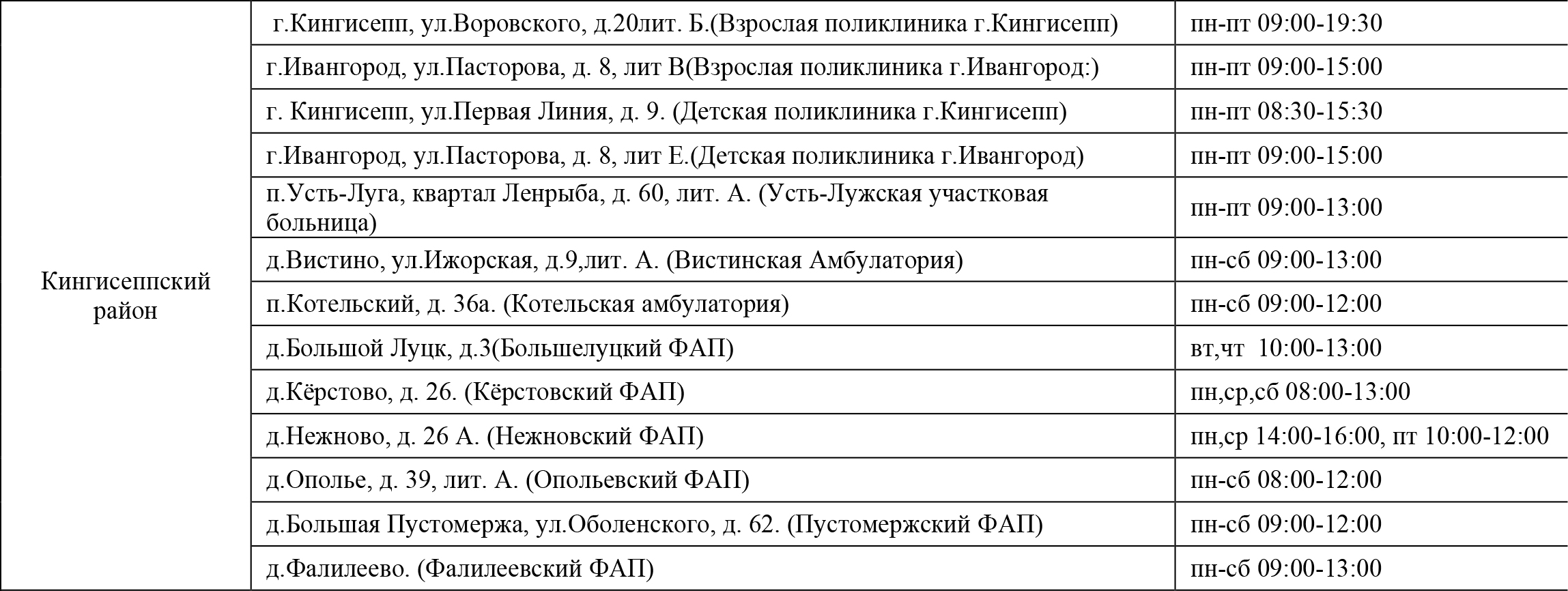 График работы прививочных стационарных пунктов для вакцинации населения Ленинградской области против гриппа в 2024 году (Кингисеппский район):