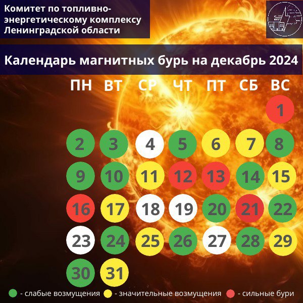 С начала декабря прогнозируется геомагнитная активность выше допустимых показателей, сообщает телеграм-канал комитета по топливно-энергетическому комплексу Ленинградской области.