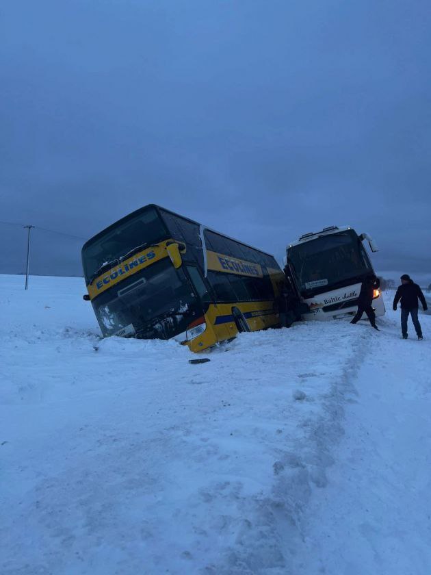 Из-за непогоды в Эстонии сразу три пассажирских автобуса, следовавших из Таллина до пункта пропуска "Нарва – Ивангород" на эстонско-российской границе оказались в снегу на обочине эстонского участка трассы E20, сообщает 47news.