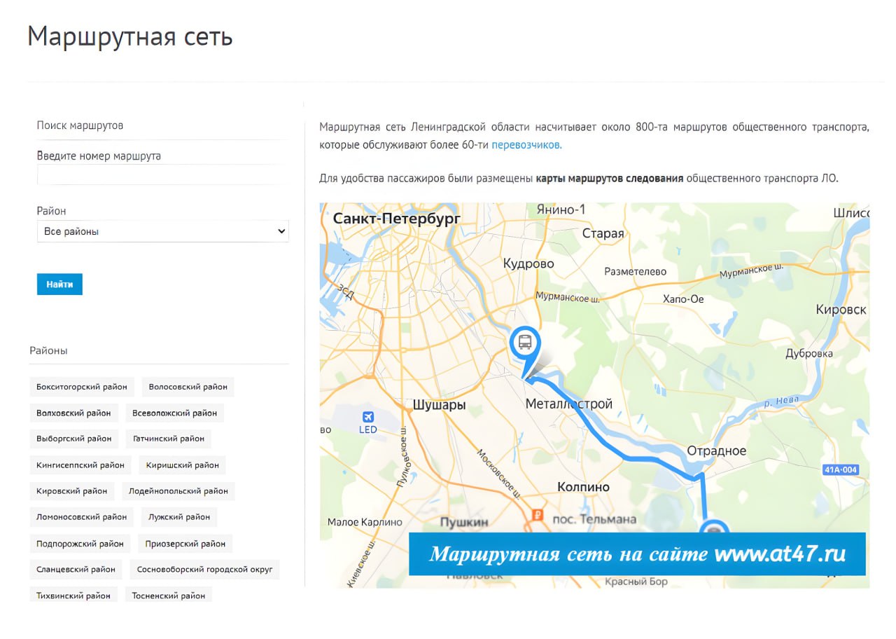 Теперь актуальное расписание автобусов, работающих по смежным межрегиональным и межмуниципальным маршрутам, обслуживаемым по заказу Комитета Ленинградской области по транспорту, можно узнать на сайте ГКУ «Леноблтранс» https://at47.ru/marshrutnaya-set/, сообщает телеграм-канал Комитета по транспорту региона.
