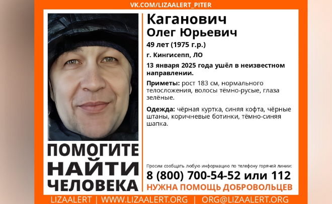 Поисковый отряд «Лиза Алерт» объявил о поисках 49-летнего жителя Кингисеппа Олега Юрьевича Кагановича. 13 января он ушёл из дома и до сих пор не вернулся, сообщает ЛенТВ24.
