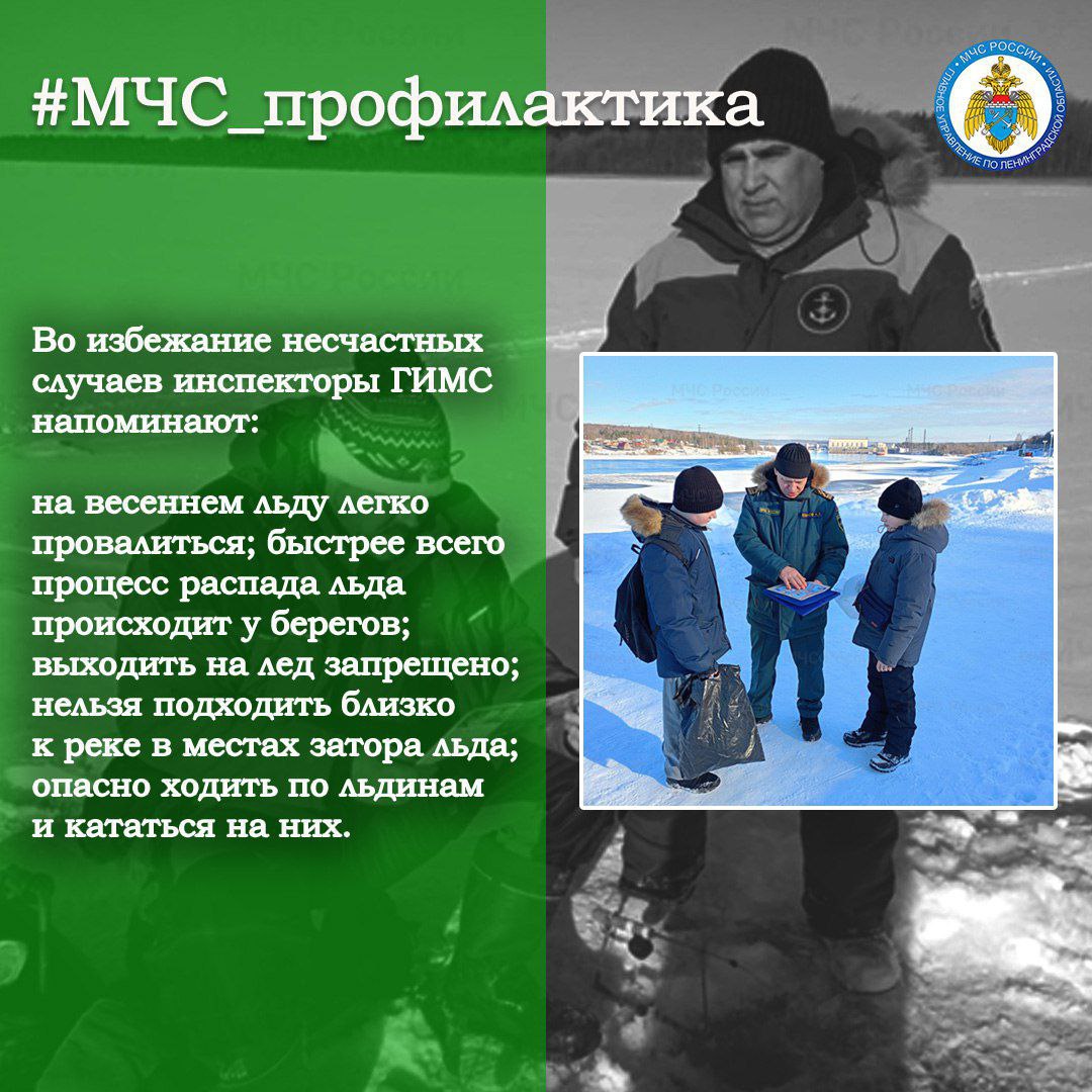 Инспекторским составом Центра ГИМС ГУ МЧС России по Ленинградской области ведется постоянная работа с населением: инспекторы распространяют профилактические материалы о запрете выхода и выезда на лед, проводят лекции и занятия в образовательных организациях по правилам безопасного поведения на водных объектах.