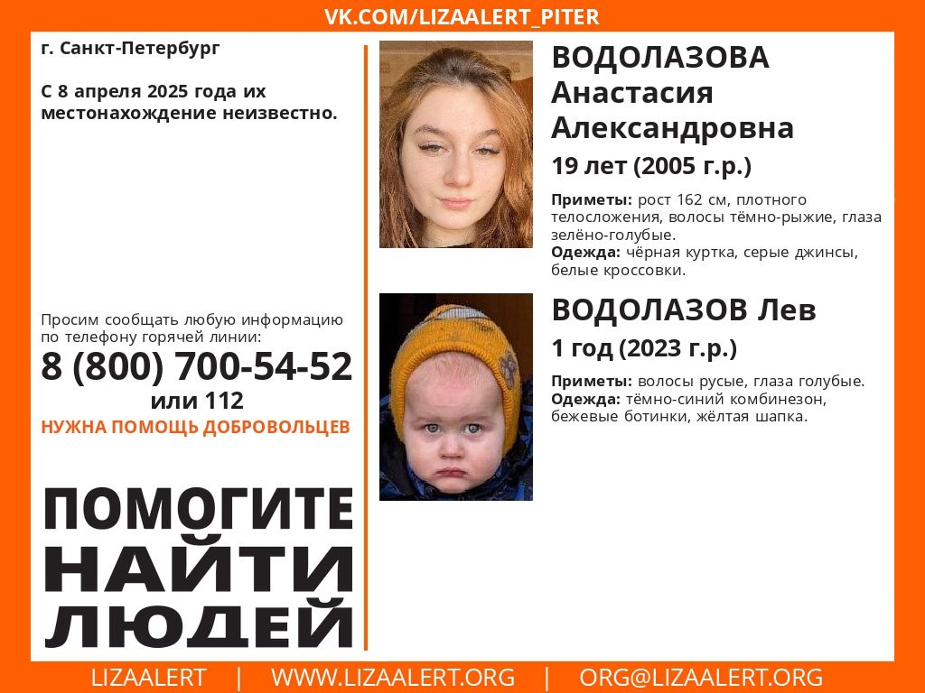 В поисковом отряде "ЛизаАлерт" 10 апреля сообщили, что в Петербурге пропали 19-летняя Анастасия Водолазова и мальчик Лев, которому почти два года. Их местонахождение неизвестно с 8 апреля.