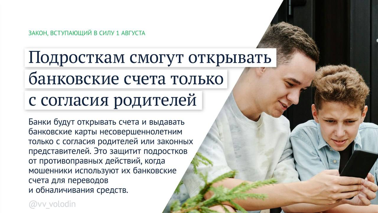 Вячеслав Володин в своём телеграм-канале рассказал о законах, вступающие в силу в августе.