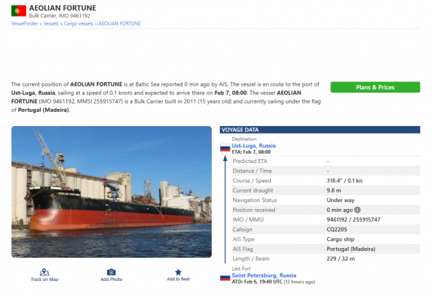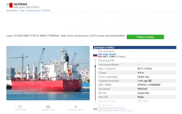 В открытых источниках нашлось упоминание обоих балкеров. Они выполняли рейсы из Петербурга в Усть-Лугу. Glyfada шел под флагом Мальты. Длина сухогруза - 199 метров, ширина - 32. Из Санкт-Петербурга он стартовал в начале двенадцатого вечера. Aeolian Fortune шел тем же маршрутом под флагом острова Мадейра - автономного региона Португалии. Габариты этого сухогруза - 229 метров в длину и 32 метра в ширину. Из порта Петербурга он вышел в 19:40 6 февраля.