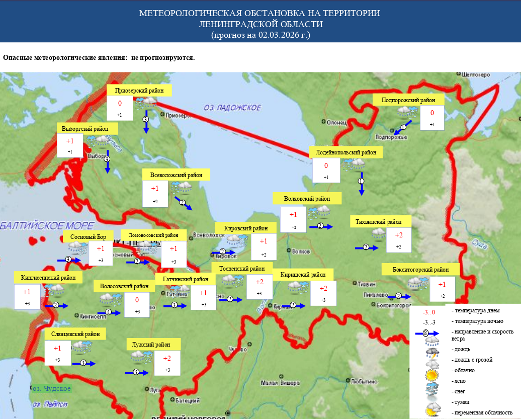 Согласно ежедневному прогнозу по Ленинградской области ФГБУ "Северо-Западное УГМС" от 01.03.2026: в 47 регионе будет пасмурно.