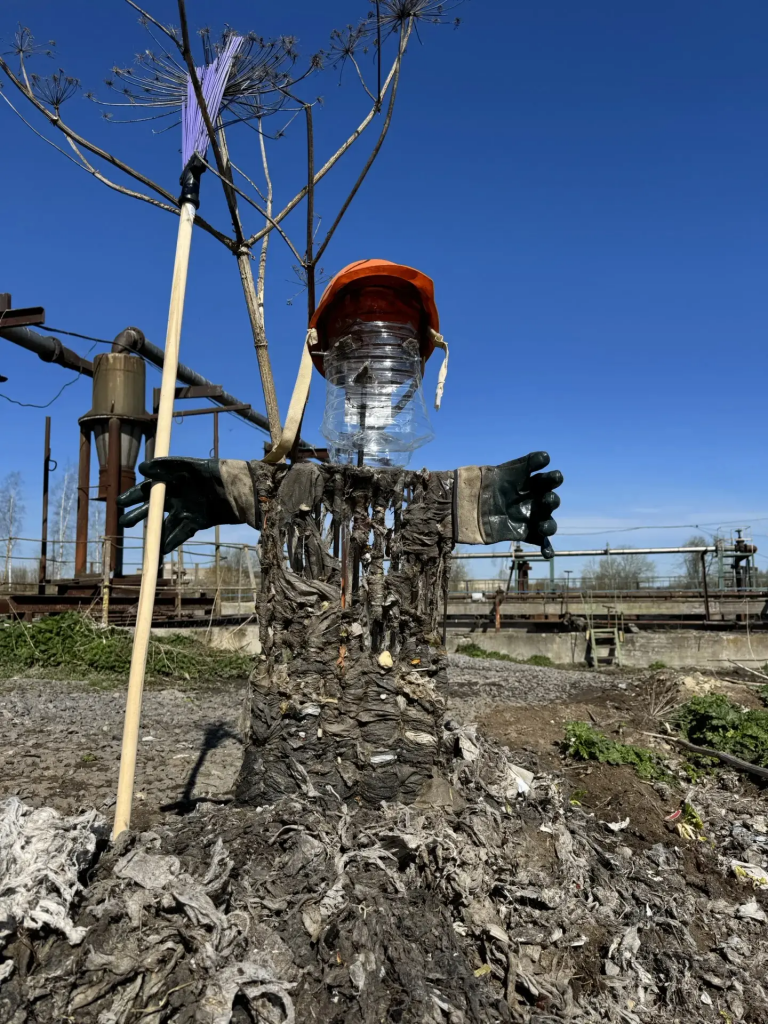 На субботнике в Коммунаре мусора из канализации набралось на целое чучело. Фигура с перчатками, каской и метлой символично напоминает жителям, что категорически не подходит на роль бытовых отходов.