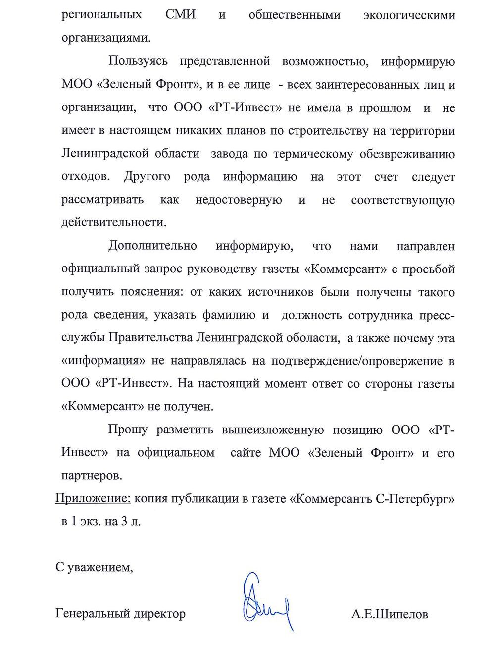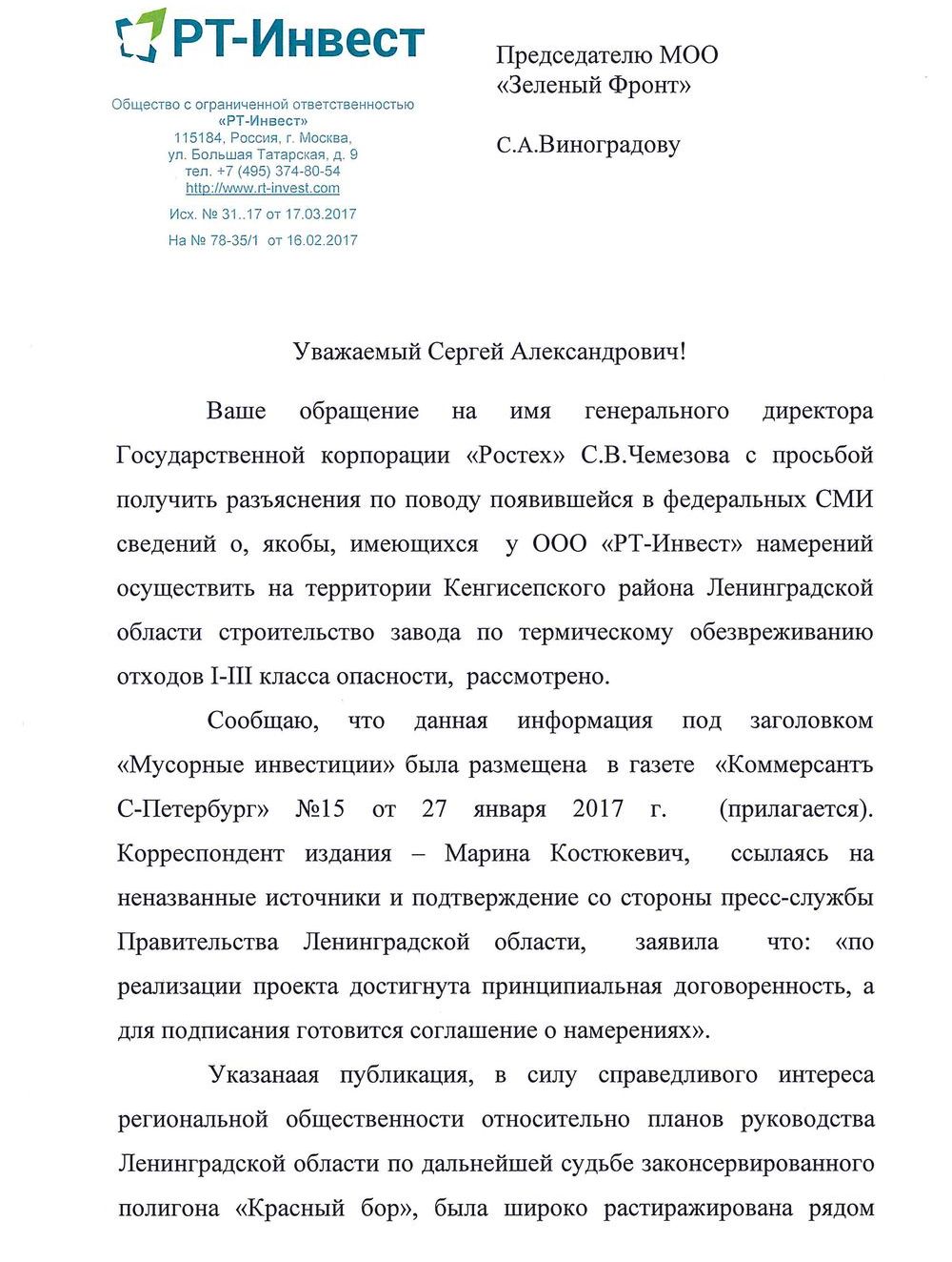 В адрес «Зеленого Фронта» поступил ответ из ООО «РТ-Инвест» на письмо, которое активисты направили в Государственную корпорацию «Ростех» с просьбой дачи разъяснений по поводу появившейся в федеральных СМИ сведений о намерениях юридического лица осуществить на территории Кингисеппского района Ленинградской области строительство завода по термическому обезвреживанию отходов I-III классов опасности.