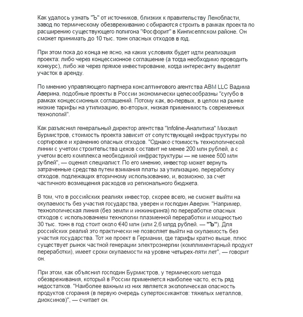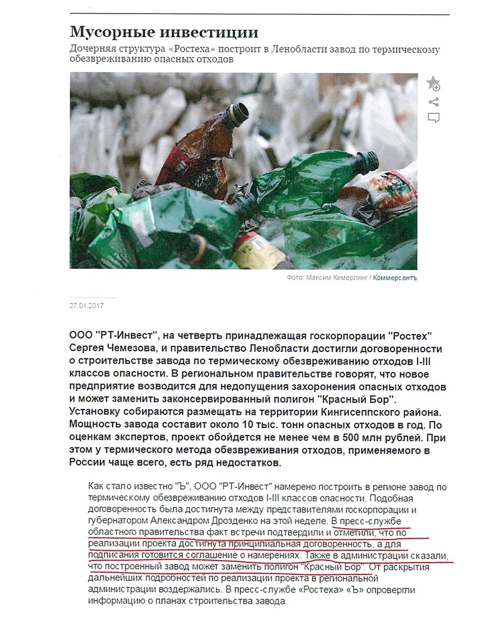 Напомним, о договоренности правительства Ленобласти и компании, на четверть принадлежащей госкорпорации «Ростех» по строительству завода по термическому обезвреживанию опасных отходов, который может заменить законсервированный полигон «Красный Бор» стало известно в конце января 2017 года. Жители Кингисеппского района заподозрили полигон, расположенный в промзоне «Фосфорит», однако как позже выяснили эко-активисты МОО «Зеленый Фронт», существующий в промзоне «Фосфорит» полигон построен для размещения собственных и не столь опасных отходов завода и никаких планов по размещению объекта, аналогичного полигону «Красный Бор», администрация завода не имеет. Тогда активисты и обратились в ГК «Ростех» с просьбой предоставить информацию о своих планах по строительству в регионе завода по термическому обезвреживанию отходов.