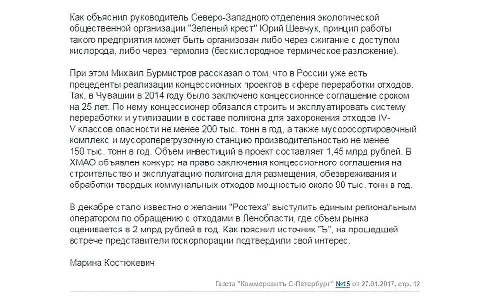 Как сообщили в официальном ответе ООО «РТ-Инвест», данная организация не имела в прошлом и не имеет в настоящем никаких планов по строительству на территории Ленинградской области завода по термическому обезвреживанию отходов. Другого рода информацию на этот счет, как сообщается в письме, следует рассматривать как недостоверную и не соответствующую действительности.