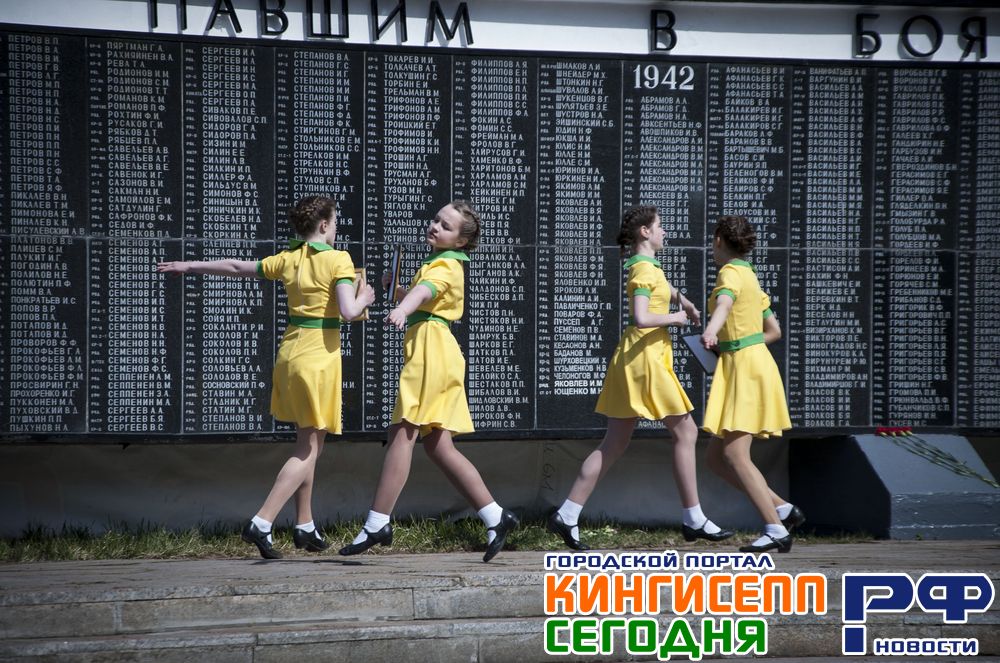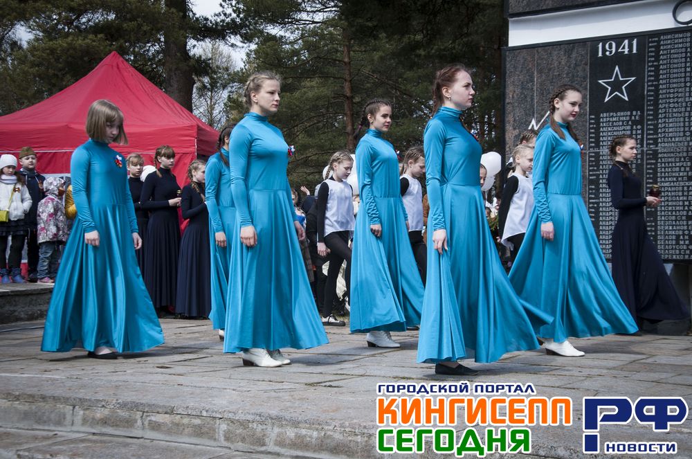 Колонна проследовала до Рощи Пятисот, где была подготовлена праздничная программа от коллективов города. «Любавушка», «Юниданс» и «Ди-Сейшн», студия «Бельканто», коллективы «Радуга», «Конфети» и «Ритмикс», так же гимнастки и спортсмены (тренер Ирина Крутикова), Кингисеппский народный театр, юные вокалистки и отделение танцевального спорта ДЮСШ "Ямбург" (рук. Михайлова Т.А.).