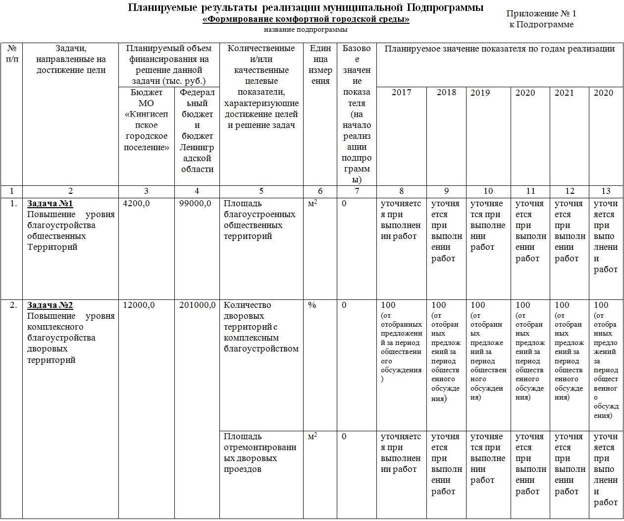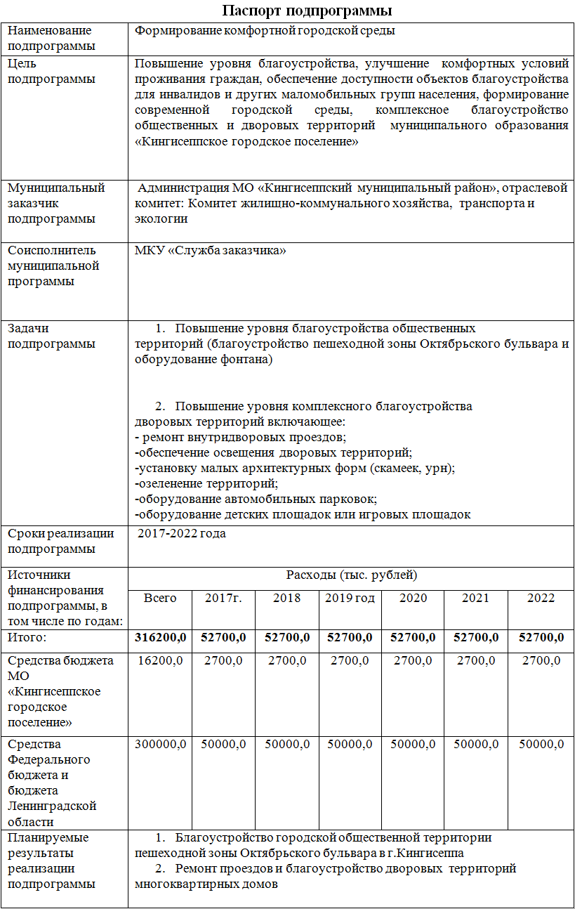 ПРОЕКТ подпрограммы «Формирование комфортной городской среды» муниципальной программы «Развитие жилищно-коммунального хозяйства и благоустройство территории Кингисеппского городского поселения»