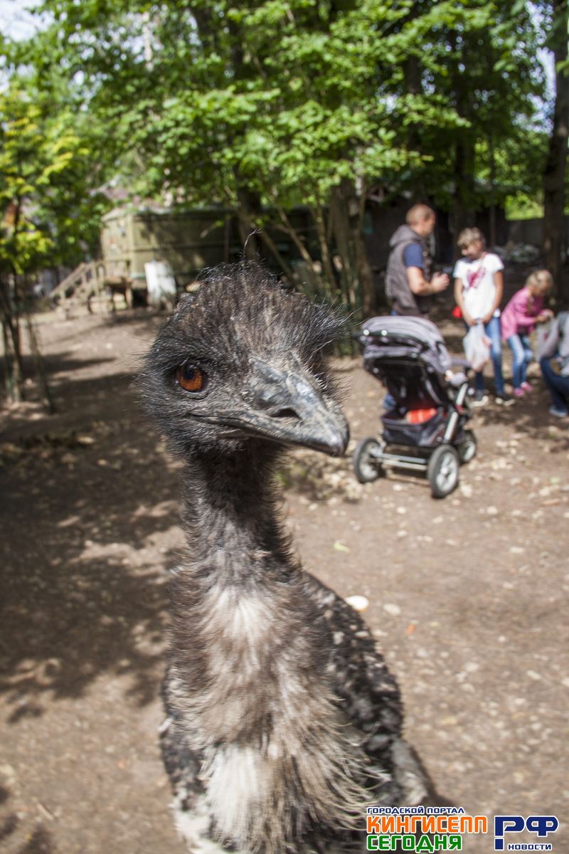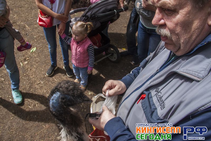 Страус породы эму по прозвищу Муля с нескрываемым любопытством осматривает содержимое рук одного из мужчин из нашей группы. Но посетитель вовремя это замечает, и птице не удается осуществить задуманное.