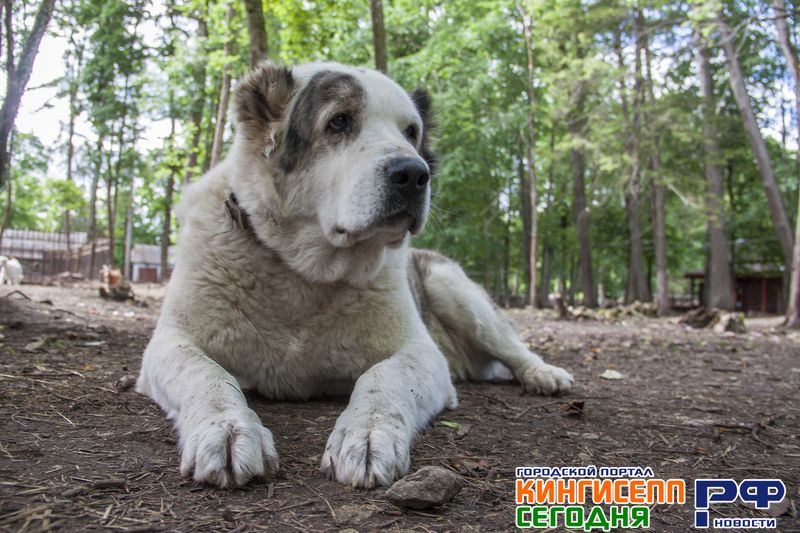 Среднеазиатская овчарка Яша разлеглась на дороге, видно, что она просто наблюдающий.