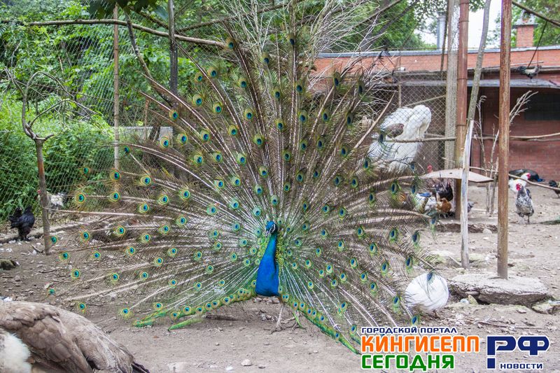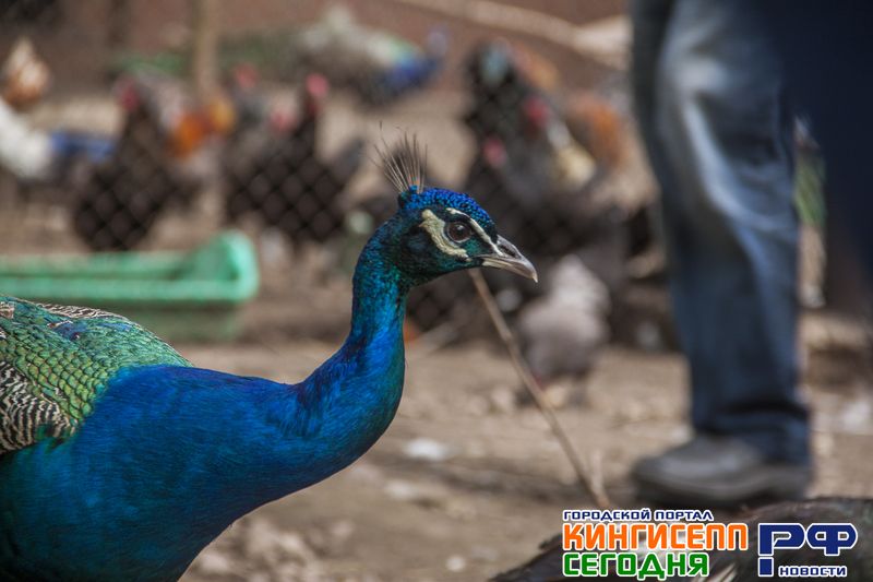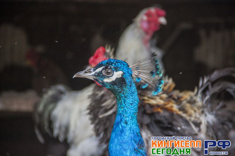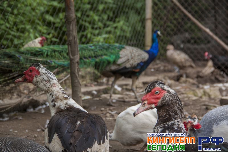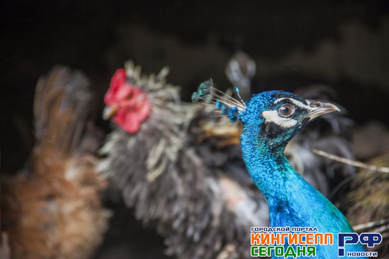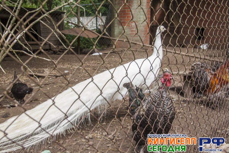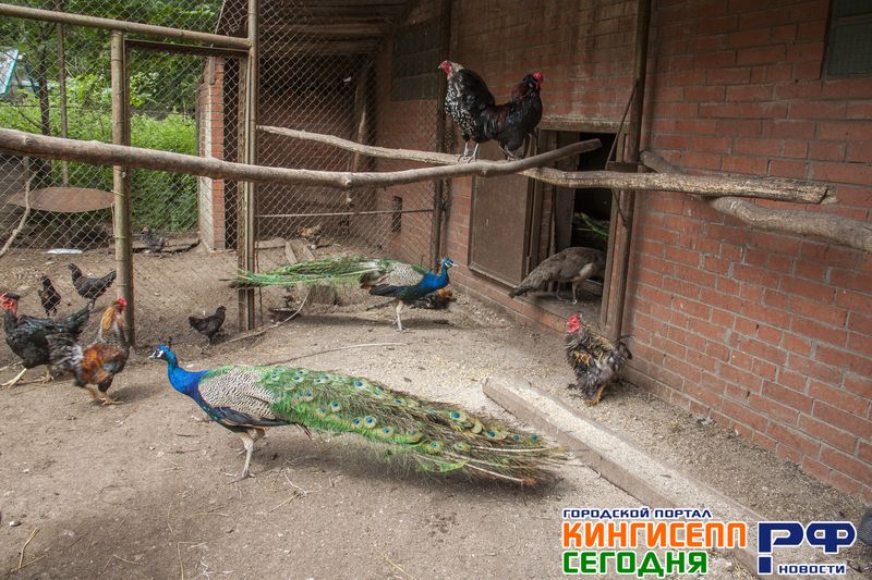 Геннадий Сергеевич направляет зевак к закрытому вольеру с различной птицей. Здесь нас ожидают курицы и голуби, фазаны, индюки, цесарки и даже павлины пяти видов.