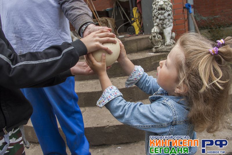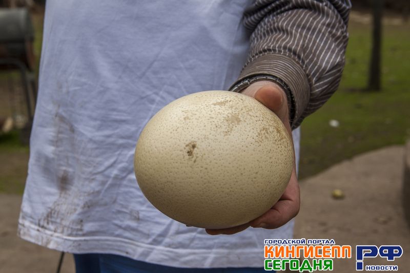 Возле хозяйского домика желающим дают потрогать настоящее страусиное яйцо. Даже образовывается очередь из желающих.