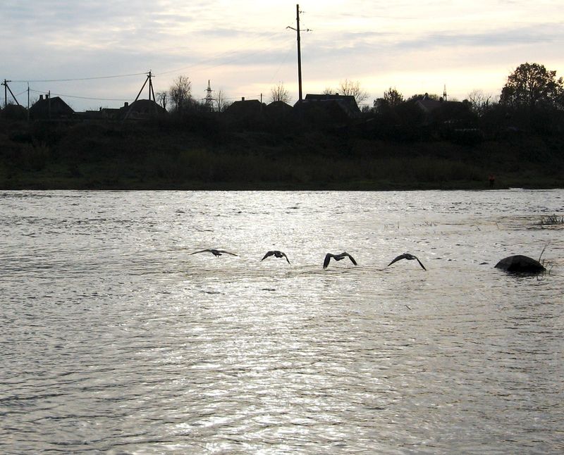 Теперь пойдем и посмотрим на Кингисеппский укрепрайон. Он включает в себя множество огневых точек - ДОТов, траншей, окопов, мы успеем увидеть лишь одну, так как на обход всех уйдет много времени, это надо приезжать тогда на целый день. Переходим по мосту на другой берег Луги, затем налево. Когда мы шли по берегу, то вспугнули необычных толстых птиц, которых я раньше не видел, и они полетели прочь. Потом выяснил, что это были белокрылые казарки - перелетные птицы, которые здесь останавливаются ненадолго, когда летят с севера в теплые страны.