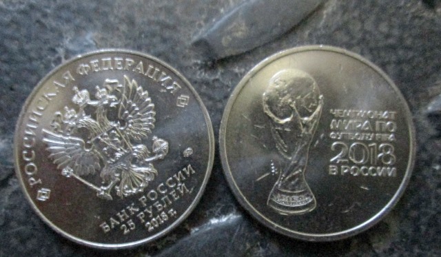 На монетах, достоинством 25 рублей изображена официальная эмблема Чемпионата мира по футболу 2018 года и надпись: «FIFA World Cup Russia 2018». Их вес составил полторы тонны.