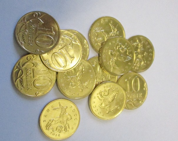 На монетах из желтого металла достоинством 10 копеек изображен Георгий Победоносец верхом на коне. Гривенников оказалось 2 мешка общим весом 7,5 килограммов. В каждом мешке по 2 000 монет.
